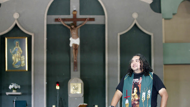 Su pelo rizado le llega a los hombros. Lo ha teñido de azul y rojo. Ahora tiene las puntas decoloradas. En su sotana usa pines del Ché Guevara y de personajes de la irreverente serie animada South Park.